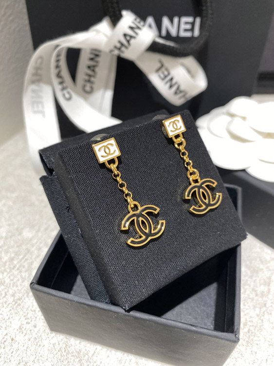 Chanel black and white enamel square double C earrings-3952